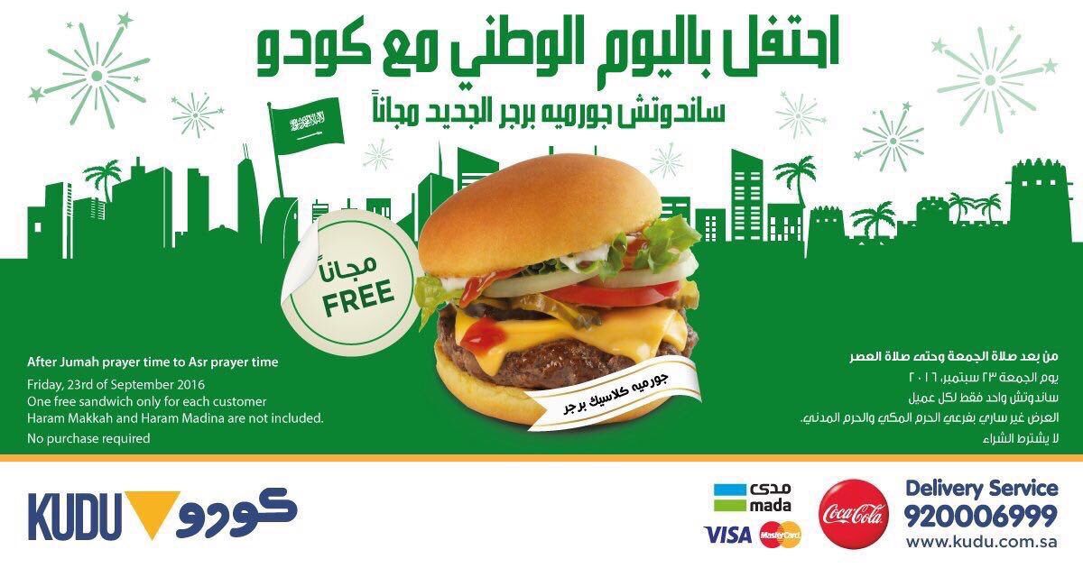 Kudu كـودو On Twitter بمناسبة اليوم الوطني إلحق عرض الهم ة من كودو واحصل على ساندوتش دجاج مجاااانا العرض ساري يوم 23 سبتمبر من 6 صباحا إلى 8 مساء اليوم الوطني89 اليوم الوطني Https T Co Fk4p1qqhb0